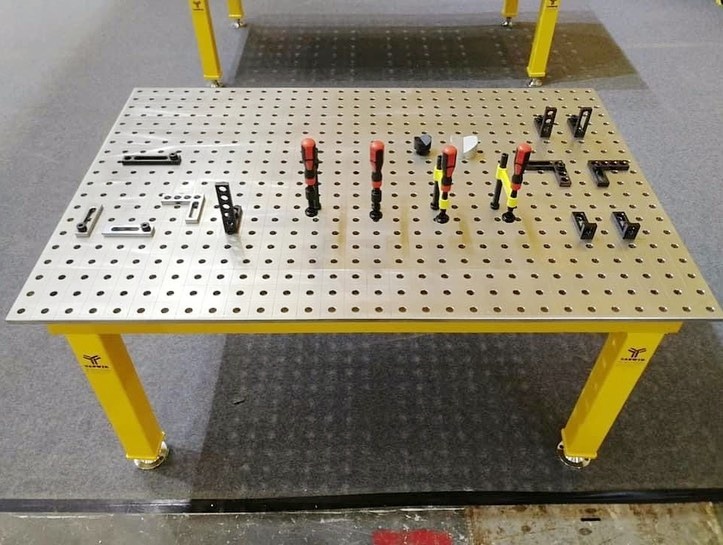 The D16 2D Welding Table has a horizontal / vertical hole arrangement in the 50 mm grid on the desk top, which is complemented on the sides with a drilling series. The diameter of the drilling hole is 16 mm, the thickness of the material approx. 11,5-13 mm and is manufactured with steel. Grid lines with a spacing of 50 mm help you to arrange your device.
