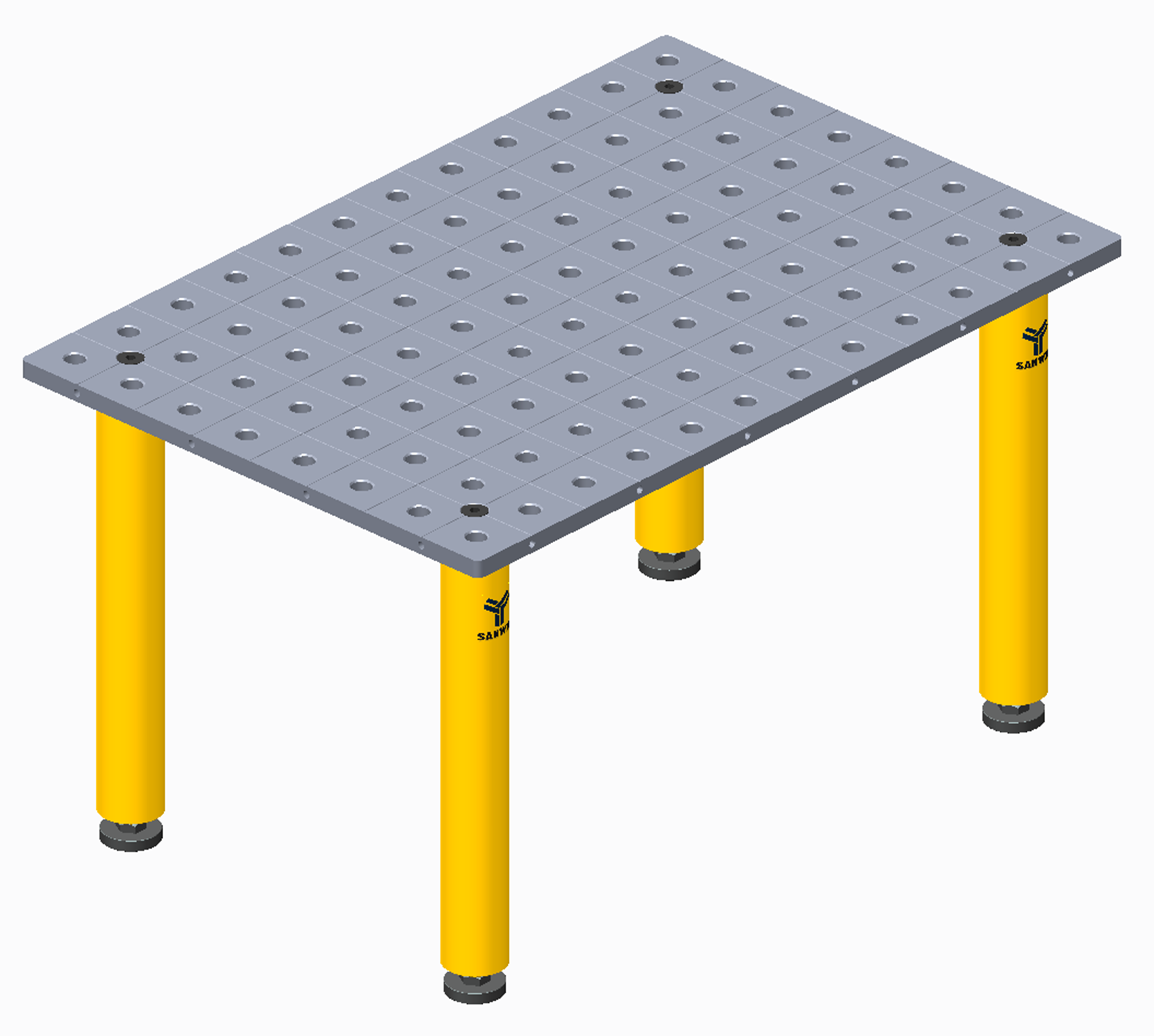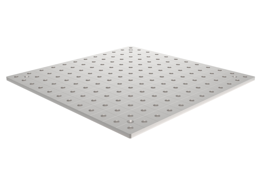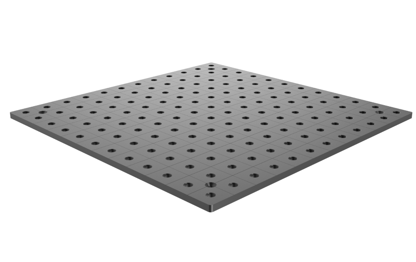 The Table Basic has a horizontal / vertical hole arrangement in the 100 mm grid on the desk top. The diameter of the bore holes is 28 mm, the thickness of the material is more or less 24,5-27 mm and it is manufactured with high-quality Steel. Grid lines in a distance of 100 mm help you to arrange your device.